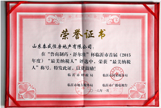 近日,臨沂市首屆“最美納稅人”評選頒獎盛典在臨沂市廣播電視臺舉行。山東泰盛恒房地產有限公司獲此殊榮。