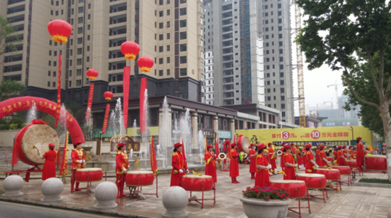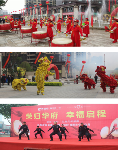 鑼鼓齊鳴迎盛事,舞獅威猛慶歡樂(lè),5月9日,沂州路和金一路交匯處臺(tái)地園林入口,彩旗林立,噴泉輝映,在喜慶的鑼鼓聲中,金泰華府·北府(2#5#6#7#9#)提前六個(gè)月拉開(kāi)了交房的帷幕。
